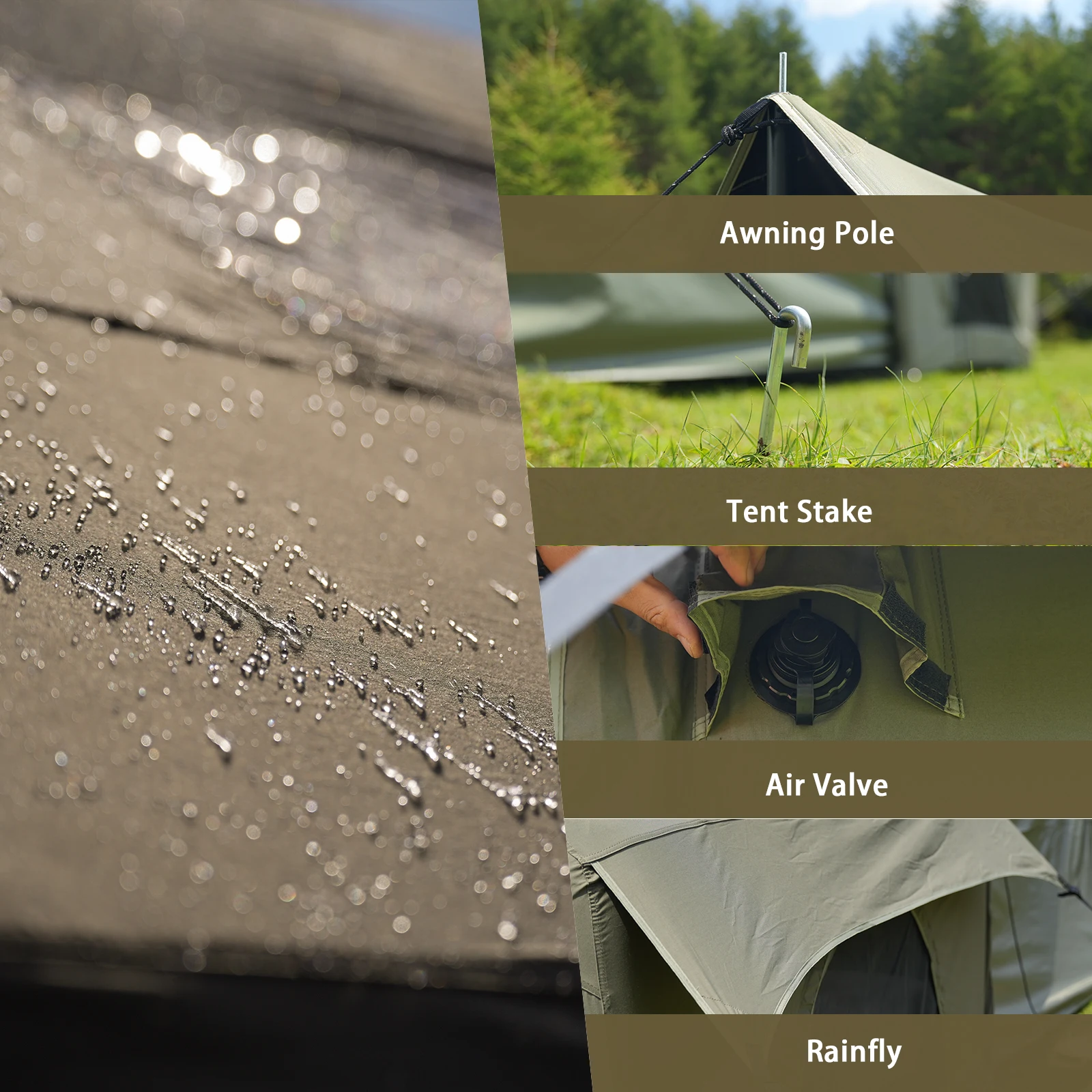 This 8-person inflatable glamping tent offers a spacious and comfortable outdoor living experience, perfect for family camping and extended stays. Featuring mesh windows for ventilation and insect protection, it provides a bright, airy interior while maintaining privacy. The extra-large canopy creates a versatile living room area for relaxing, dining, or storing gear, enhancing overall comfort at camp. Designed for quick and easy setup with an included hand pump, this durable inflatable tent combines convenience, stability, and ample space for a premium outdoor adventure.